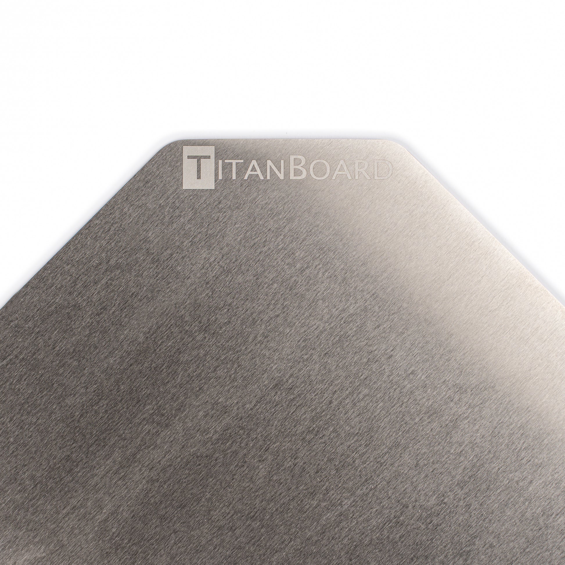 Our TitanBoard ® made of high-quality, 2mm-thick pure titanium will fulfill all your wishes if you are looking for a more hygienic and sustainable alternative to plastic or wooden cutting boards. In use, it produces significantly less plastic abrasion in the form of microplastics compared to plastic cutting boards.